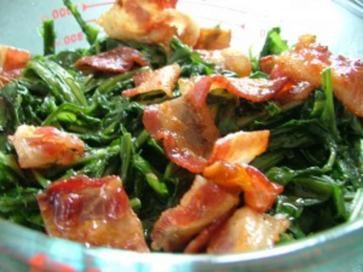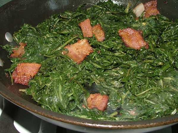 Cut up bacon into small 1-inch square pieces, fry until done. Take your 4 cups of well-drained dandelion greens and place them in the frypan with cooked bacon and grease; toss.